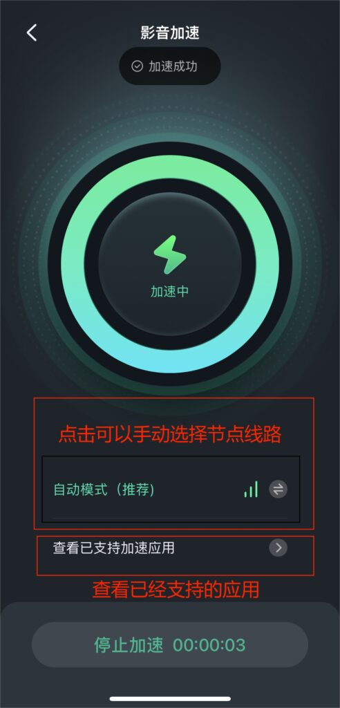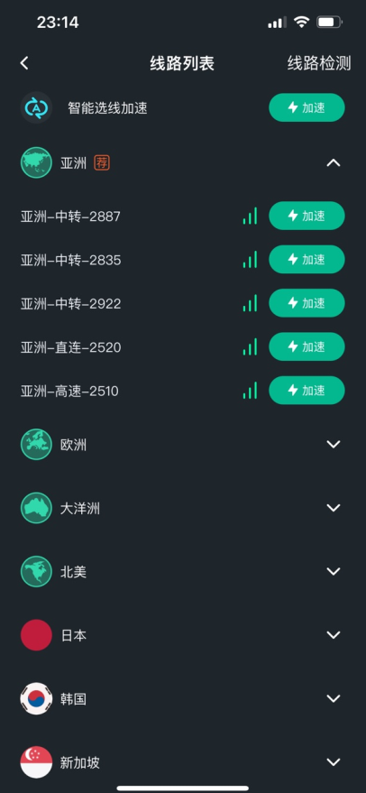 点击上图中入口就可以进入线路选择界面,手动选择节点线路,推荐选择节点延迟相对较低的。