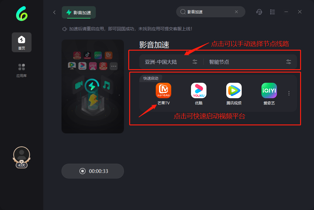 点击右侧快速启动,可一键快速启动应用,此时应用已经没有限制,可以顺利观看国内电视剧了!