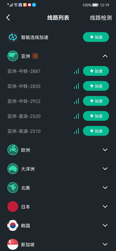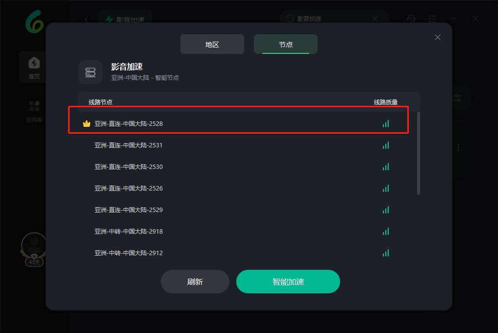 点击快速启动上方可以进入线路选择界面,手动选择节点线路,推荐选择节点延迟相对较低的线路。